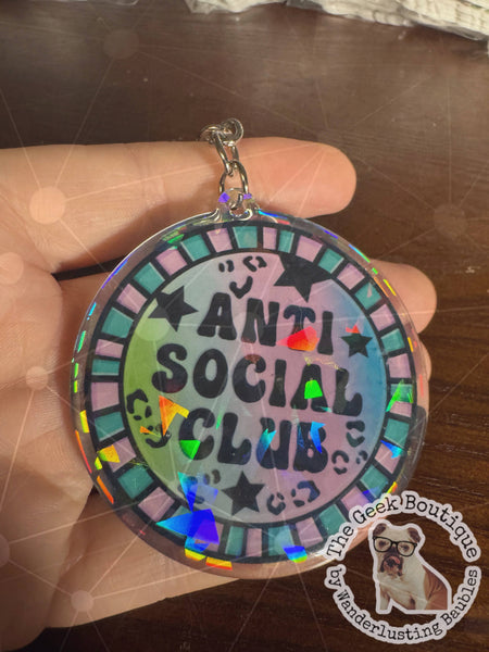 epoxy keychain, accessory, key, anti social social club, introvert, snarky, loner, hermit, people suck, homebody, book reader, quiet, independent