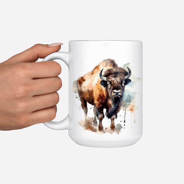 Bison Buffalo Watercolor Looking Right Ceramic Mug - 15oz