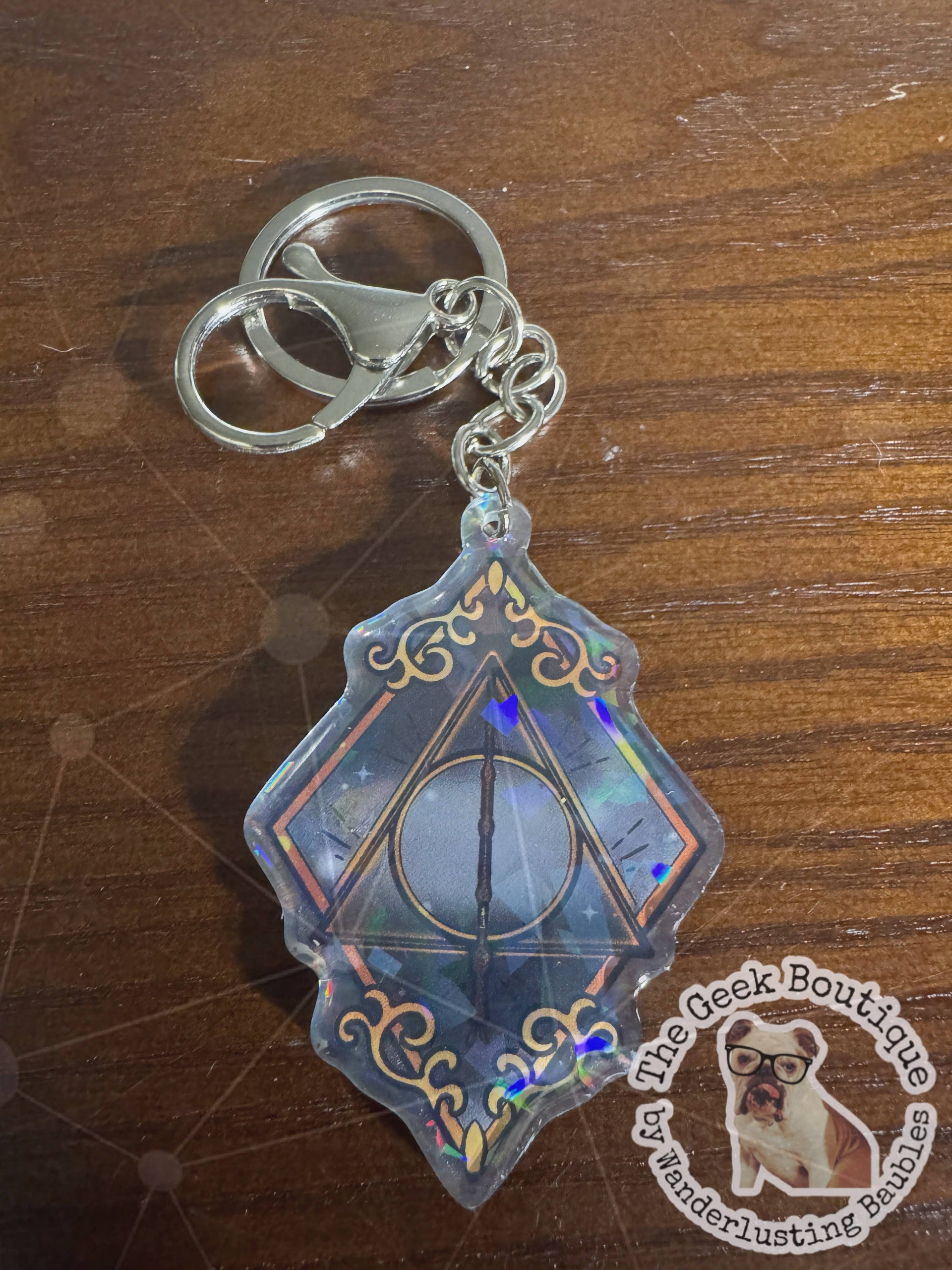 Keychain, accessory, gift ideas, accessories, keys, collectible, bookish, magical, wizard, house, badger, yellow, young adult novel, fantasy, middle grade novel, loyal, true, book series, red, blue, green, raven, snake, lion, brave, cunning, ambitious, eagle, deathly hallows, wand,