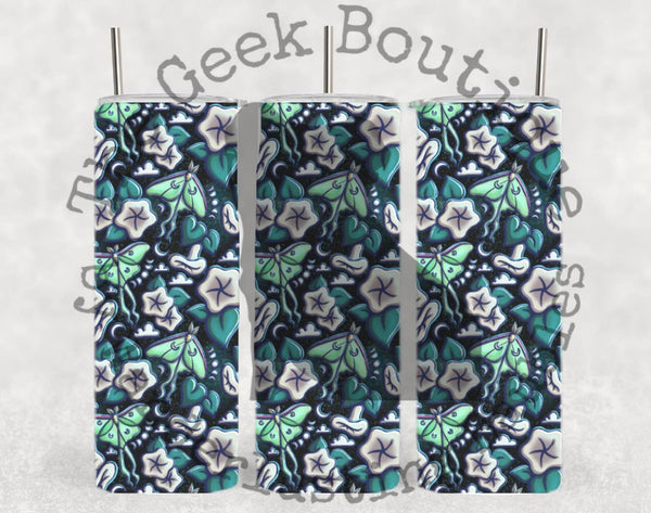 Moon Flower Navy Moon Moth Floral Collage Nature Tumbler
