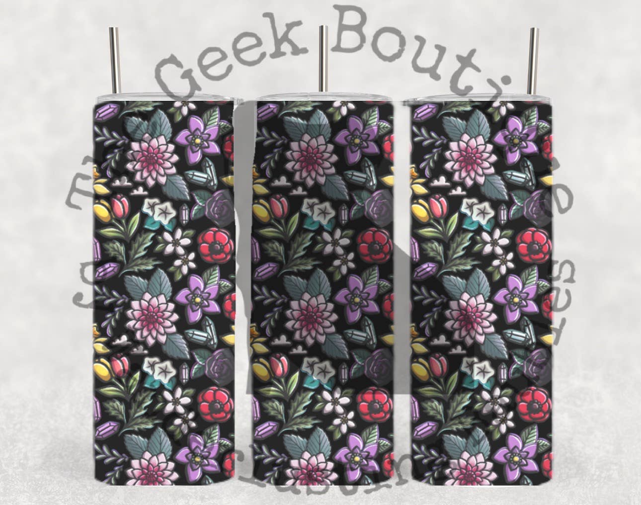 Black Floral Collage Flower Mum Tulip Poppy Gardenia Tumbler