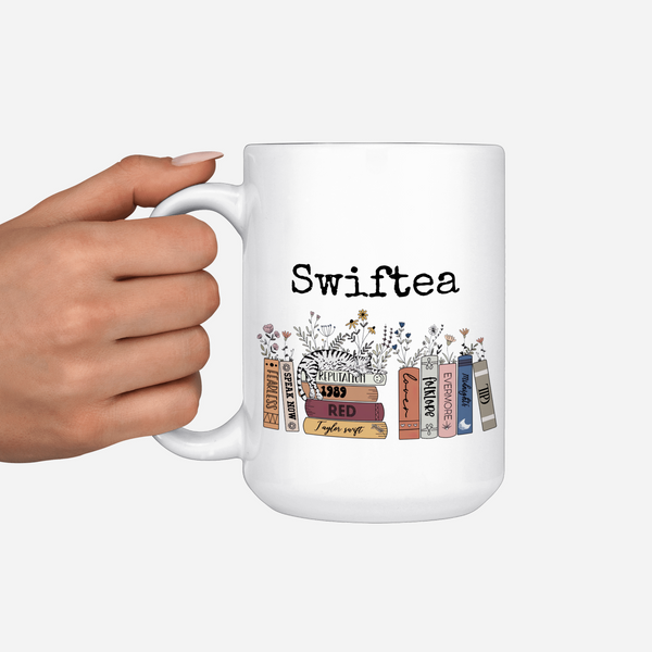 One 15oz ceramic mug with T- Swift's albums, books and cats. Print or Script with "Swiftea" written on it. Perfect for tea lovers.