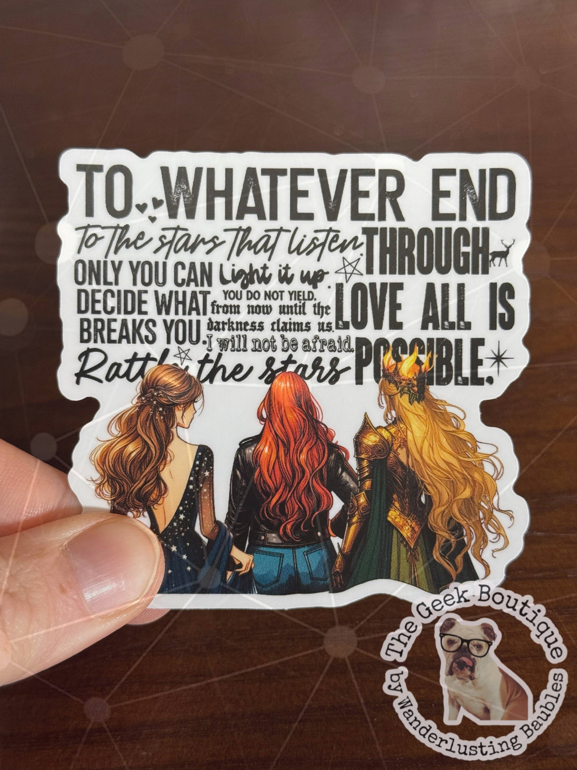 Vinyl sticker, waterproof, bookish, book, ACOTAR, book cover, bibliophile, nerd, geek, the geek boutique, romantasy, romance, fantasy, new adult, SJM, To Whatever End, Throne of Glass, Crescent City, Bryce, Aelin, Feyre, bookish quotes, rattle the stars, through love all is possible