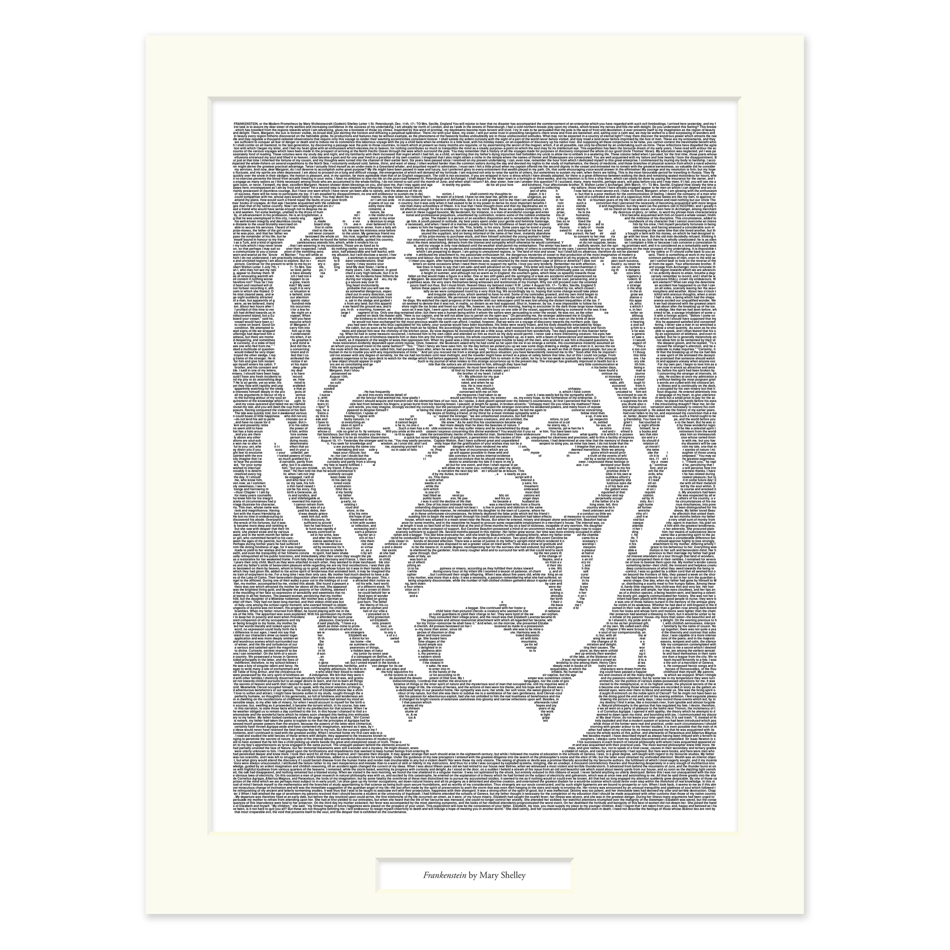 At Litographs, we create art from books. From afar, each matted print features a beautiful design representing a character, setting, or the theme of the book. Up close, you'll discover that the background is made from the words themselves.